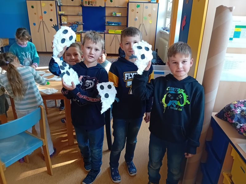 Připravovali jsme se na nadcházející Halloween- Klaunween, který už děti netrpělivě vyhlížely. Přípravy probíhaly v plném proudu. Vyrobili jsme si krásné duchy ze čtvrtky a vaty, které nám zdobí družinovou třídu. Strašidelné netopýry a nakonec klauny z harmonikové techniky.
