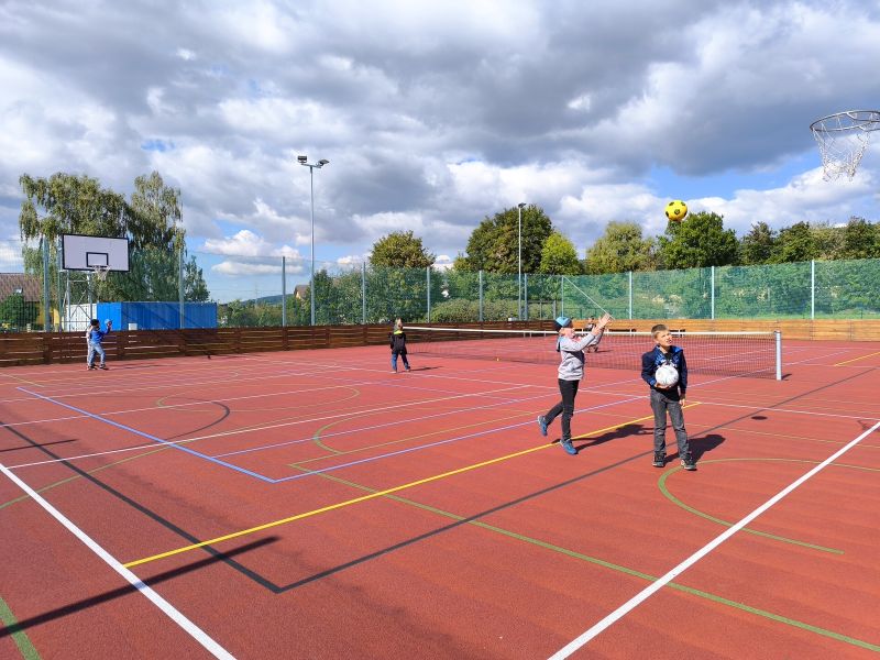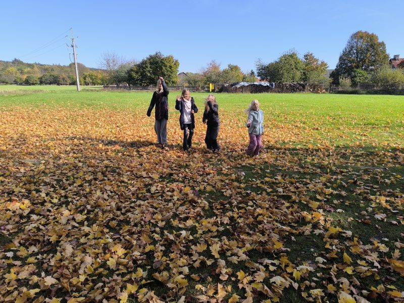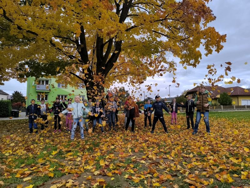 Na školním hřišti jsme si hráli s podzimním listím – stavěli jsme z něj domečky, dělali jsme si listové bitvy nebo jsme jen tak házeli listy do vzduchu a užívali si barevný podzim. Nechyběly ani sportovní aktivity – hráli jsme fotbal, přehazovanou a ti, kteří zrovna nechtěli soutěžit, si prostě jen užívali volný pohyb na hřišti.