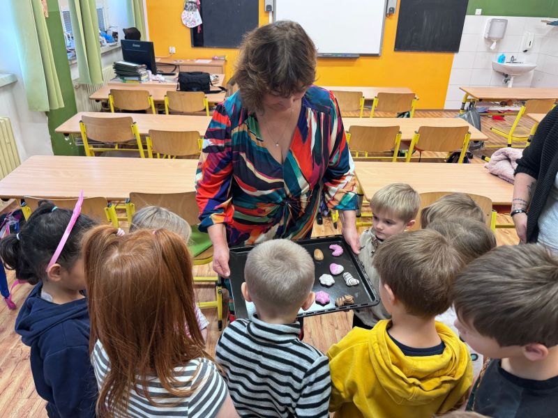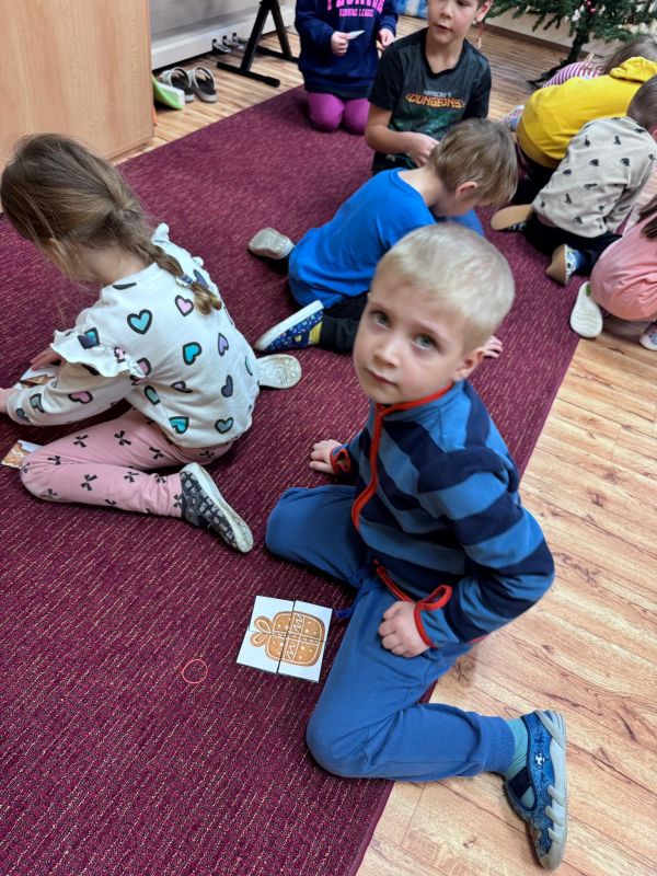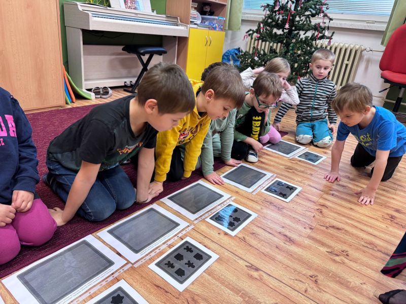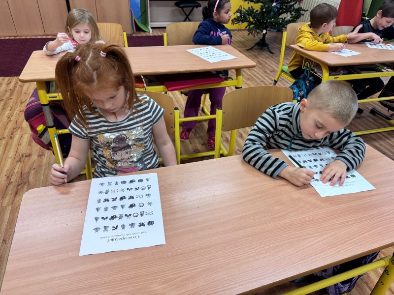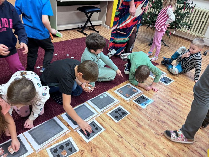 Tentokrát bylo naše setkání motivované vánoční tematikou. Společně jsme si sdělili zážitky z včerejšího veřejného vystoupení celé mateřské školy. Vyprávěli jsme si nad vánočními obrázky jedné vánoční rodiny, pojmenovávali jsme vánoční předměty a hledali hlásku na začátku těchto slov, zahráli jsme si hru s kartičkami Já mám, kdo má. Učili jsme se zpívat písničku s pohybem o vánočním zvonečku. A protože k Vánocům patří perníčky, pustili jsme se do jejich „pečení“. Skládali jsme jejich obrázky z několika částí, pak jsme je rovnali na plechy podle zadaného vzoru. Perníčky jsme také museli ochutnat, byly výtečné. Vyzkoušeli jsme, jak se sedí v lavicích páťáků. Zde jsme v pracovním listu vyškrtávali opakující se obrázek v řadě a jako správným školákům na konci práce zazvonilo.